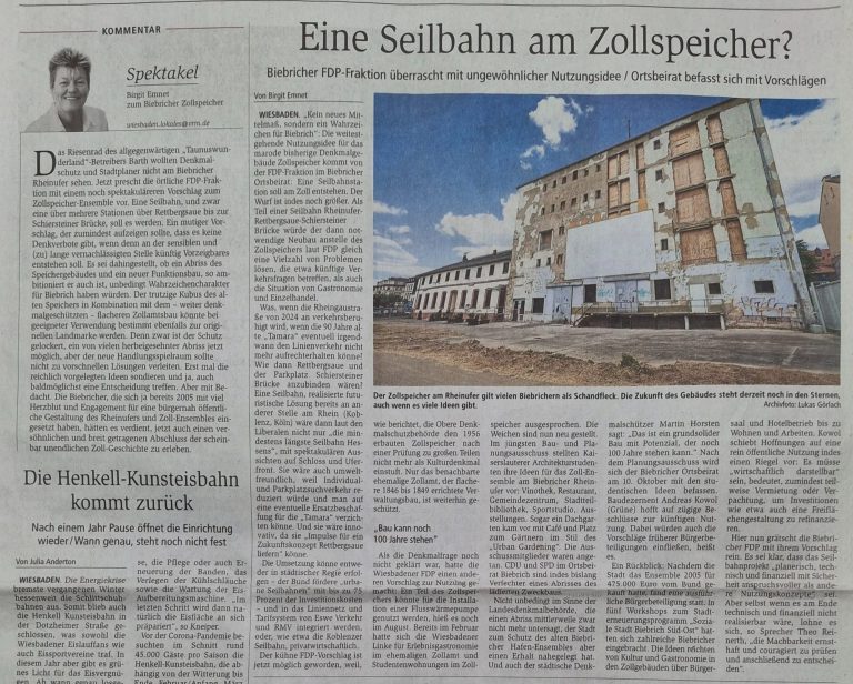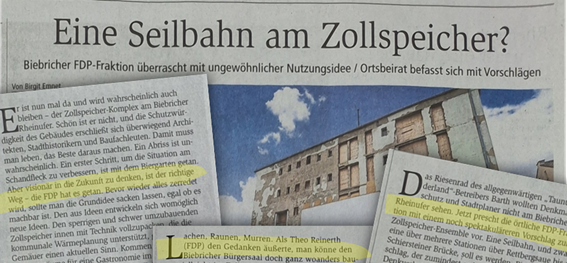 So wird in der Zeitung die Idee der FDP kommentiert, im Zollspeicher eine Seilbahnstation zu errichten und den Zollspeicher mit der Rettbergsau und dem Parkplatz unter der Schiersteiner Brücke zu verbinden. Gebäude wirtschaftlich genutzt. Verkehr entlastet, Tourismus gestärkt.