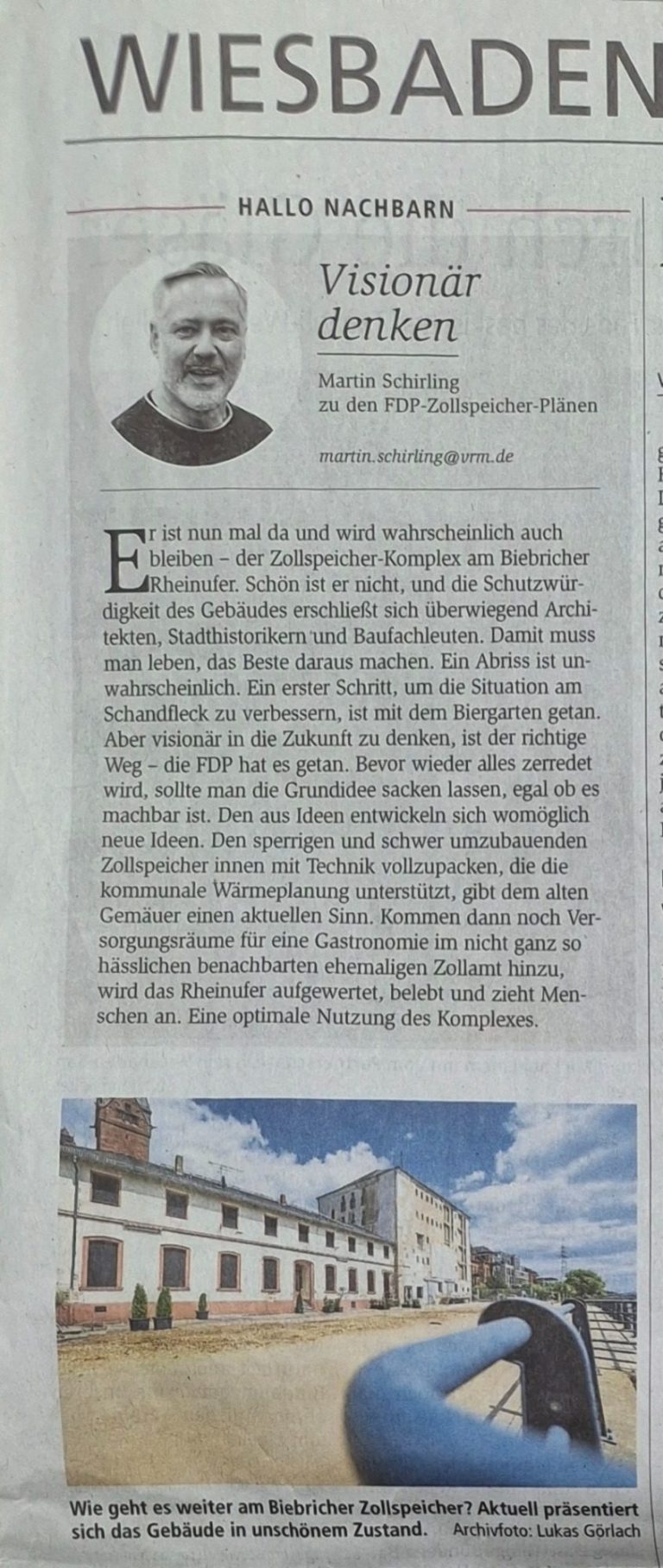 Während sich die denkmalschutzrechtliche Prüfung des Zollspeichers in die Länge zog und gar nichts passierte, ergriff die FDP mit einem Vorschlag einer technische Nutzung des Gebäudes die Initiative. Einer visionären Idee, wie der Wiesbadener Kurier befand.